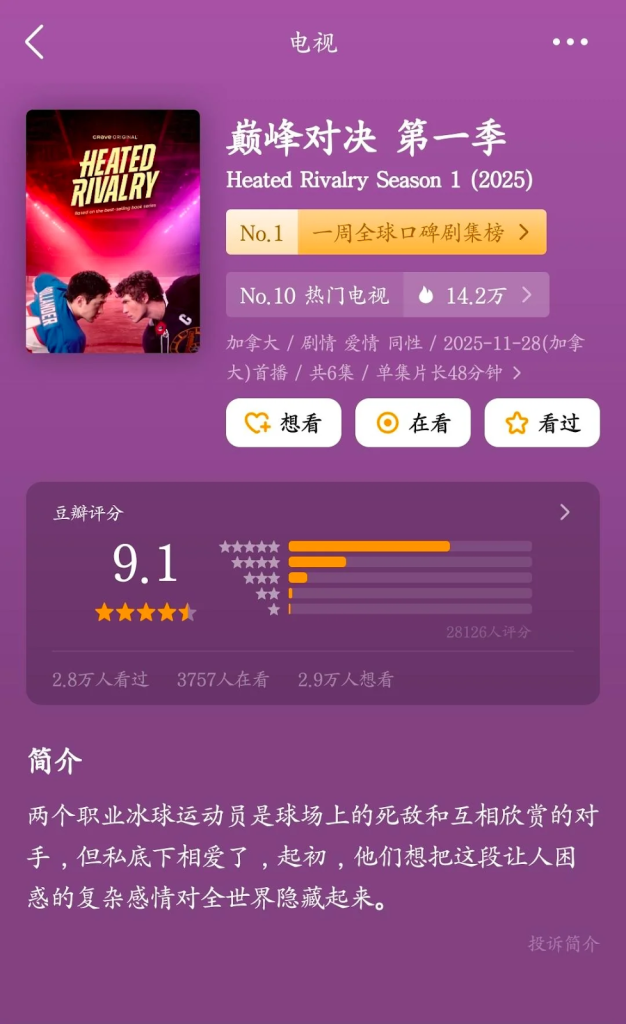 Con una calificación de 9.1 en Douban (como un Letterbox o IMDB), Heated Rivalry “debutó” en China en el top de shows extranjeros, superando en puntaje de calificación a uno de los clásicos como Stranger Things o Emily en París. A pesar de que los contenidos LGBTQ+ tienen una fuerte restricción en el país asiático, gracias a la piratería hoy es una de las series más vistas y mejor calificadas.