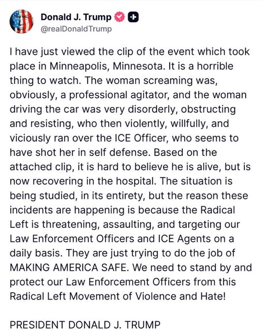 El presidente de los Estados Unidos salió en defensa del uniformado del ICE que asesinó a tiros a Renee Good. A través de una publicación en la red social Truth Social, calificó el incidente como “horrible”; sin embargo, en todo momento respaldó la versión del Departamento de Seguridad Nacional, el cual señaló que se trató de un caso de defensa propia. El mandatario calificó a Renee Good como una agitadora profesional tras haber visto supuestas imágenes en donde obstruía una operación federal.