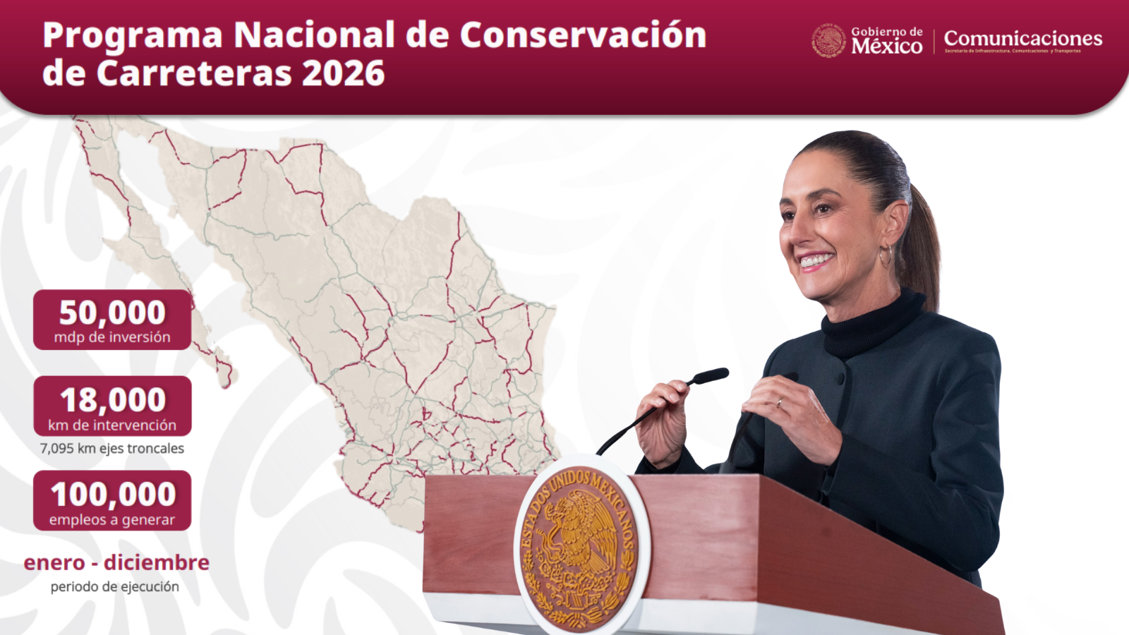 El día de hoy, desde su conferencia en Palacio Nacional, la presidenta Claudia Sheinbaum destacó que la estrategia será ejecutada por la Secretaría de Infraestructura, Comunicaciones y Transportes (SICT), la cual también estará apoyada en la adquisición de trenes de repavimentación, lo que permitirá un uso más eficiente de los recursos públicos. Por su parte, el titular de la SICT, Jesús Antonio Esteva Medina, detalló que este proyecto se enfocará principalmente en los ejes troncales, por donde circula el 92 % de la carga y el 80 % de los pasajeros del país.